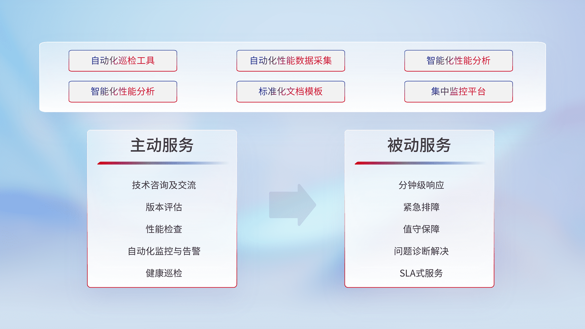 智能化工具和标准化文档,,,,保障服务质量,,,提供主动服务(包含技术咨询、、版本评估、、、、性能检查、、、自动化监控与告警、、健康巡检)和被动服务包含(分钟级响应、、、紧急排障、、值守保障、、、、问题诊断解决、、、SLA服务)。。。。