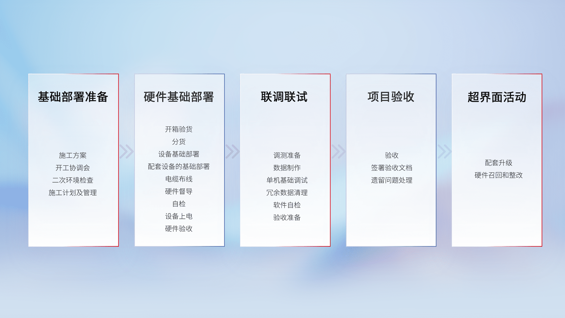 从基础部署准备、、硬件基础部署、、、、联调联试、、、、项目验收、、越界面活动的全过程可追溯,,,保证施工质量和进度。。。。