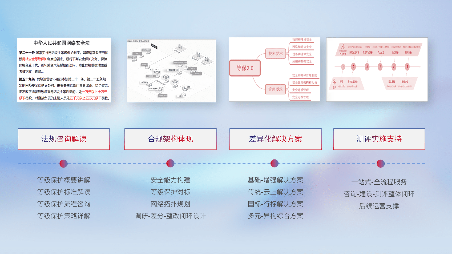 通过专业的法律咨询解读、、、、合规架构体现、、差异化解决方案、、测试实施支持等服务,,,为客户量身打造等保合规体系。。